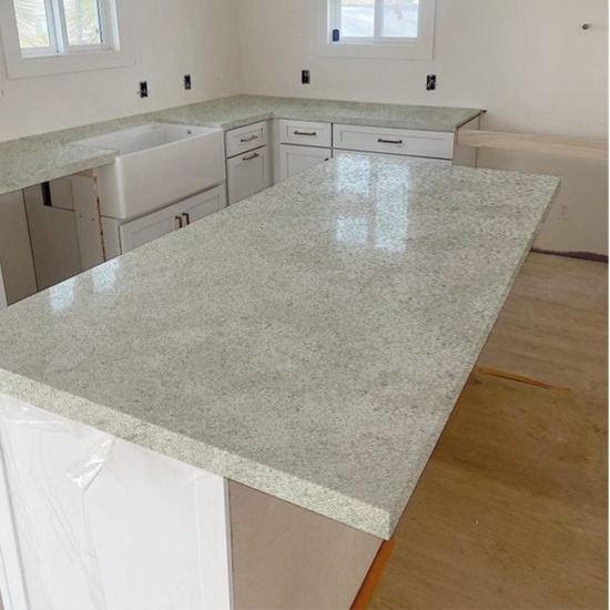 Quarz in der Ausführung „Cement White Snowflake Texture“ ist ein speziell behandeltes Quarzkompositmaterial. Es ähnelt einer matten Oberfläche, wobei die Betonoptik die Farbe des Quarzes im Vergleich zur klassischen polierten Oberfläche leicht verändert. Diese Oberflächenbehandlung wird im Zusammenhang mit Granit auch als „gebürstet“ bezeichnet.
