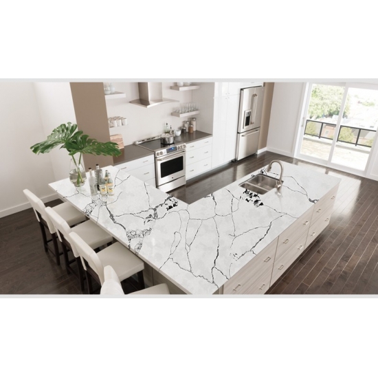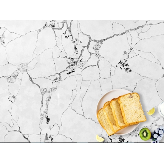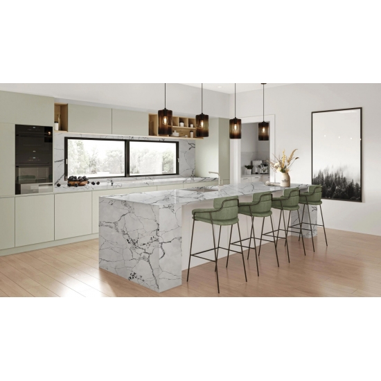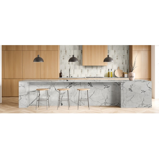 Quarz in der Ausführung „Cement White Snowflake Texture“ ist ein speziell behandeltes Quarzkompositmaterial. Es ähnelt einer matten Oberfläche, wobei die Betonoptik die Farbe des Quarzes im Vergleich zur klassischen polierten Oberfläche leicht verändert. Diese Oberflächenbehandlung wird im Zusammenhang mit Granit auch als „gebürstet“ bezeichnet.