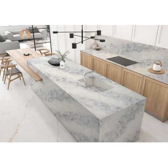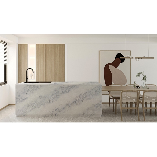 Quarz in der Ausführung „Cement White Snowflake Texture“ ist ein speziell behandeltes Quarzkompositmaterial. Es ähnelt einer matten Oberfläche, wobei die Betonoptik die Farbe des Quarzes im Vergleich zur klassischen polierten Oberfläche leicht verändert. Diese Oberflächenbehandlung wird im Zusammenhang mit Granit auch als „gebürstet“ bezeichnet.