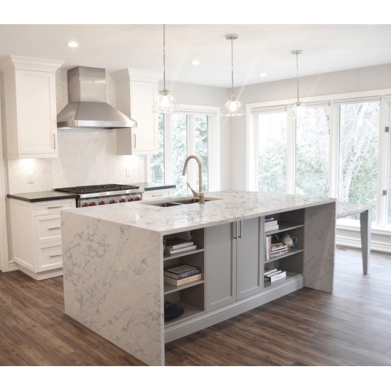 Die Calacatta-Serie ist derzeit das beliebteste Quarzsteinprodukt. Exquisit und einzigartig, besticht Calacatta-Quarz durch sein reines Weiß und die markante, durchgefärbte Marmoroptik. Mit seinem wunderschönen, breiten Adernmuster und der luxuriösen Haptik bietet dieser Quarz die natürliche Optik von Calacatta-Marmor, jedoch ohne dessen Nachteile. Calacatta-Quarz ist eine äußerst robuste, flecken- und kratzfeste Arbeitsplatte und somit eine sehr praktische Wahl für Küchen- und Badezimmerarbeitsplatten, Treppen, Fensterbänke, maßgefertigte Möbel, Wand- und Bodenbeläge im Innen- und Außenbereich, Wasserstrahlschneidtechniken und andere Designprojekte.