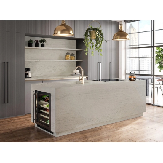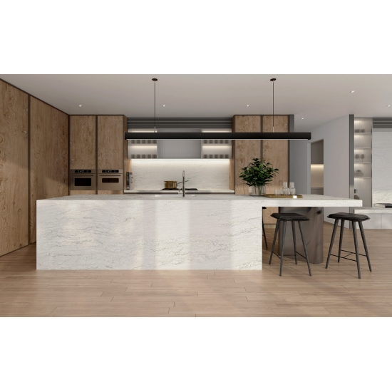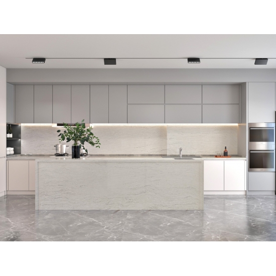 Quarz in der Ausführung „Cement White Snowflake Texture“ ist ein speziell behandeltes Quarzkompositmaterial. Es ähnelt einer matten Oberfläche, wobei die Betonoptik die Farbe des Quarzes im Vergleich zur klassischen polierten Oberfläche leicht verändert. Diese Oberflächenbehandlung wird im Zusammenhang mit Granit auch als „gebürstet“ bezeichnet.