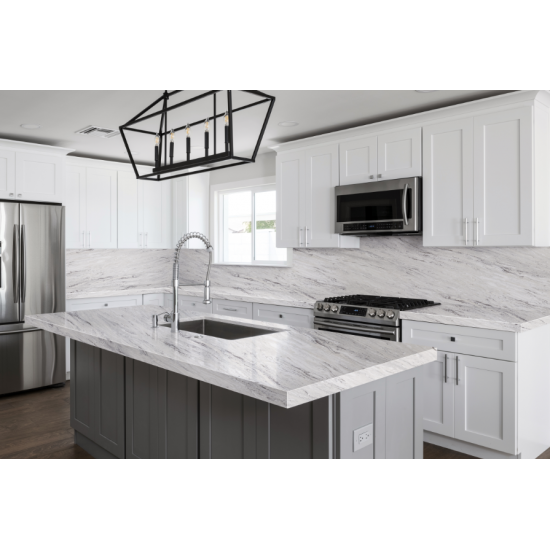 Quarz in der Ausführung „Cement White Snowflake Texture“ ist ein speziell behandeltes Quarzkompositmaterial. Es ähnelt einer matten Oberfläche, wobei die Betonoptik die Farbe des Quarzes im Vergleich zur klassischen polierten Oberfläche leicht verändert. Diese Oberflächenbehandlung wird im Zusammenhang mit Granit auch als „gebürstet“ bezeichnet.
