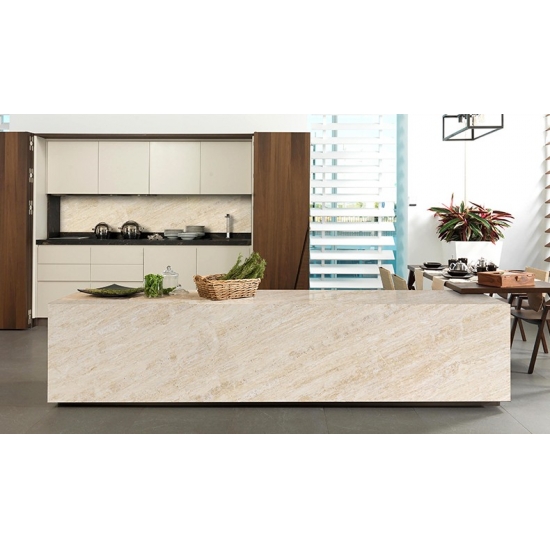 Daino Reale Beige Quartz ist ein Quarzkomposit, das eine Hommage an den legendären italienischen Naturstein darstellt. Es bildet die ikonische Schönheit des natürlichen Daino Reale Marmors meisterhaft nach und besticht durch einen warmen Beigeton, der von eleganten, gebänderten Mustern in Kaffee-, Karamell- und Elfenbeintönen durchzogen ist. Die einzigartige Einbettung fossilienartiger Details und mineralischer Schichten verleiht jeder Platte visuelle Tiefe und einen unverwechselbaren Charakter. So verbindet sich jahrhundertealte sardische Eleganz nahtlos mit modernem Design und verleiht jedem Raum eine harmonische Wärme und künstlerische Anziehungskraft.