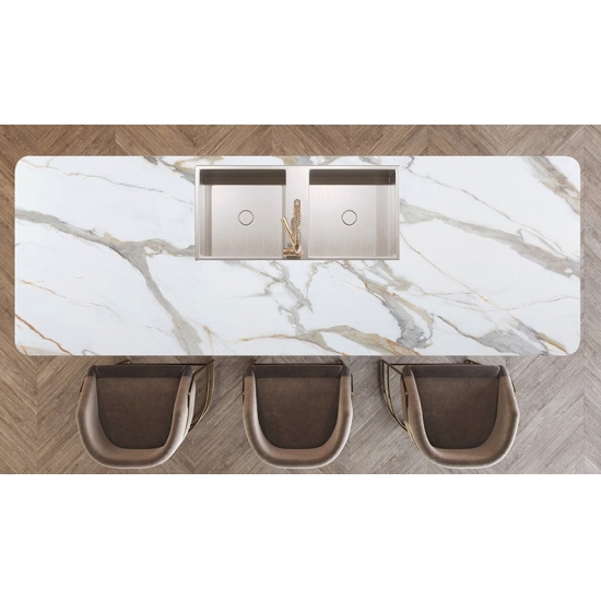 Der Quarzstein 7005 Calacatta Macchia Vecchia PD besticht durch seine dramatische weiße Oberfläche, die von markanten, anthrazitgrauen Adern mit starkem Kontrast durchzogen wird. Die dynamischen, filigranen Muster erzeugen eine kraftvolle und künstlerische Wirkung. Diese Platte verkörpert luxuriöses Flair und moderne Eleganz und eignet sich ideal als Blickfang in anspruchsvollen Interieurs.