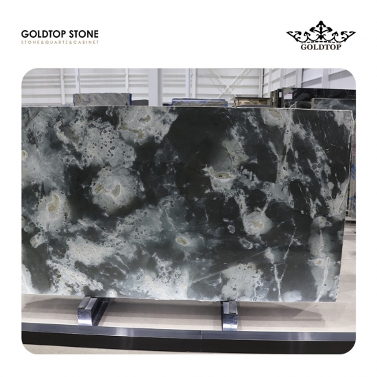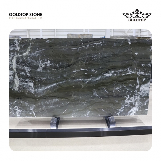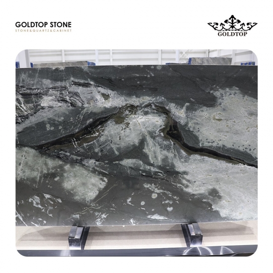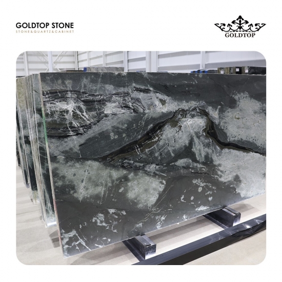 Brasilianischer kalaktischer Sternenlichtquarzit Dieser faszinierende Naturstein aus Brasilien ist bekannt für seinen tiefschwarzen Grundton, der von hypnotisierenden grünen und weißen Wirbeln durchzogen ist. Sein filigranes Muster erinnert an eine ruhige Galaxie mit leuchtenden Nebeln und bietet eine wahrhaft kosmische Ästhetik.