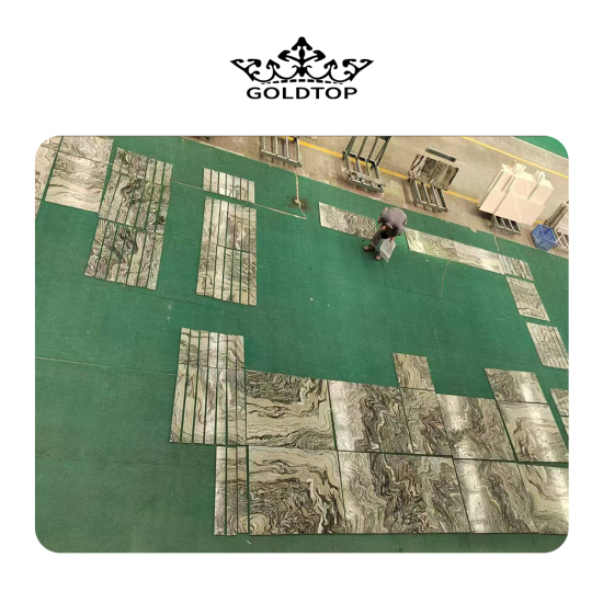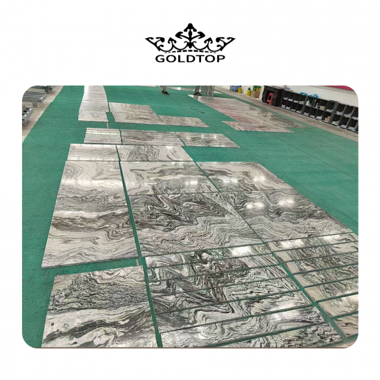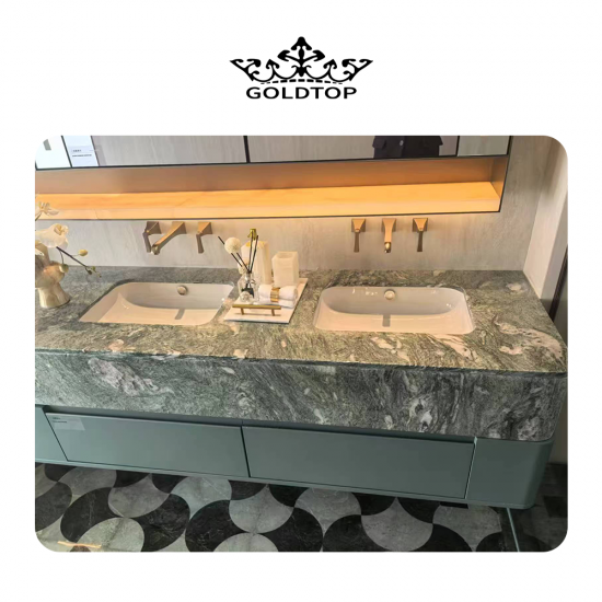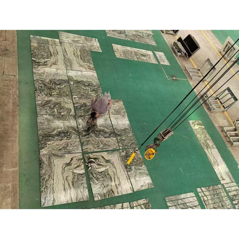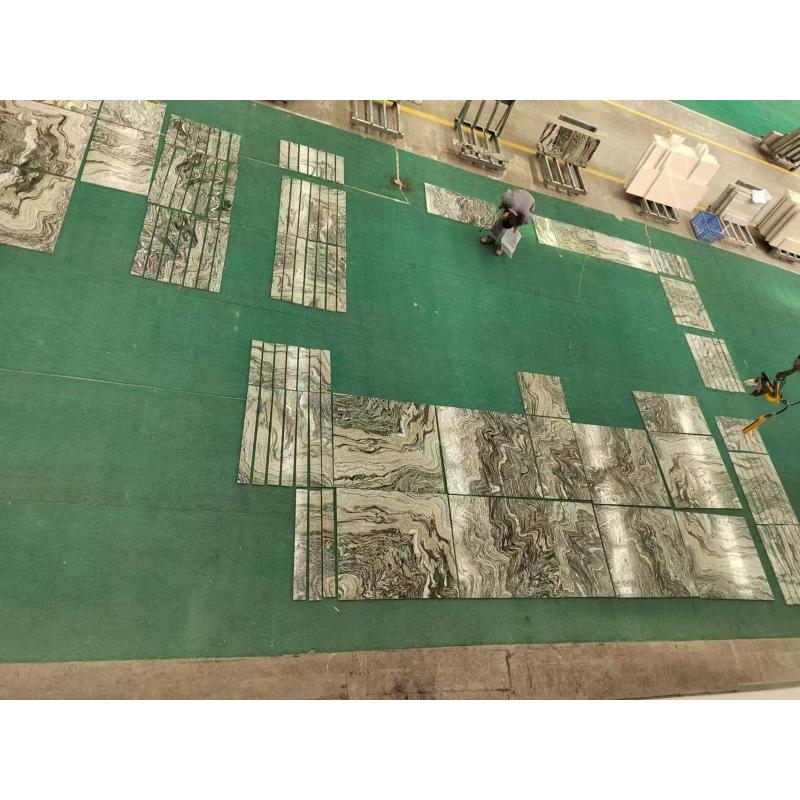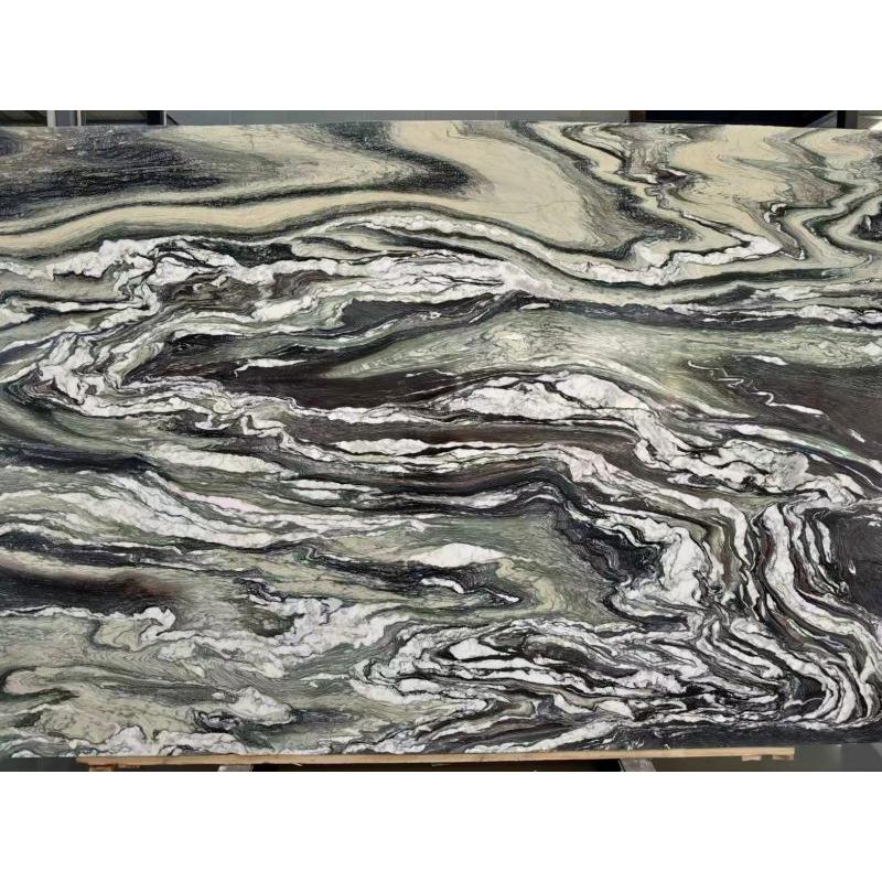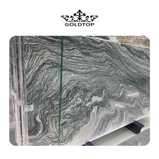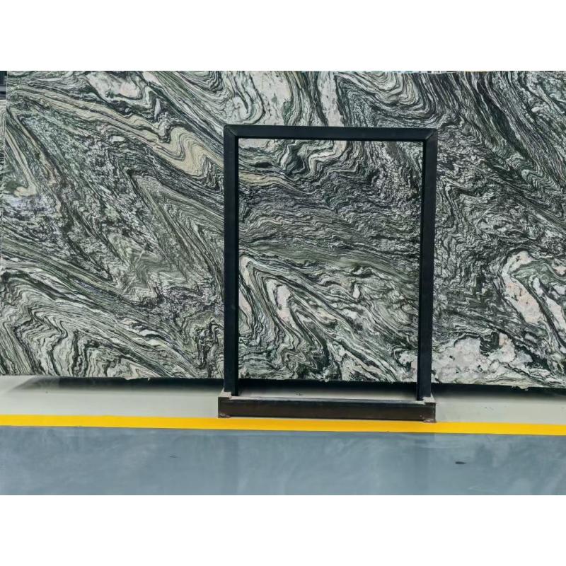 Landschaftsgrüne Marmorplatten und -fliesen Die satte, tiefgrüne Basis erinnert an die Schönheit üppiger Wälder und natürlicher Berglandschaften. Subtile Farbvariationen von Olivgrün bis Smaragdgrün verleihen Tiefe und Charakter, während die filigrane Maserung in helleren Weiß-, Beige- oder Grautönen dynamische Muster bildet, die an fließendes Wasser, Nebel oder Bergkonturen erinnern. Jede Platte ist ein einzigartiges Naturkunstwerk, hochglanzpoliert, das ihren Glanz verstärkt und den markanten Kontrast zwischen dem leuchtend grünen Hintergrund und den zarten Maserungen hervorhebt.